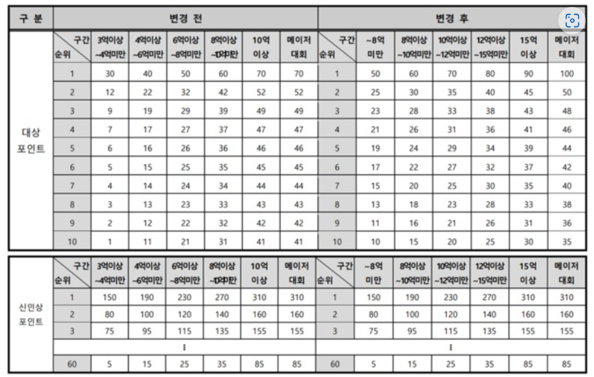 한편, KLPGA는 지난해 1월 31일에 2023년 KLPGA 이사회를 통해 대상과 신인상 포인트가 부여되는 상금 구간을 현실적으로 수정하고, 대상 포인트를 상향 조정하여 2024시즌부터 적용한다고 결정했습니다.