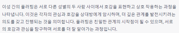 종합하면, 플러팅은 사람 간의 상호 작용에서 로맨틱한 호감이나 관심을 표현하는 것으로서 대부분 긍정적인 의도와 감정으로 이루어집니다. 그러나 적절한 문맥과 상황에서 행해져야 하며, 상대방의 감정과 편안함을 고려해야 합니다. 부정적인 측면이 없는 플러팅은 상호 간의 관계를 발전시키고 연결을 강화하는데 도움이 될 수 있습니다.
